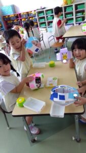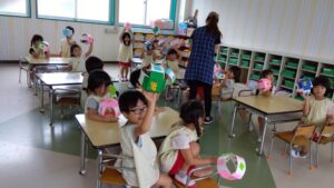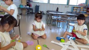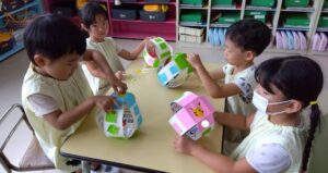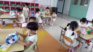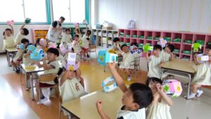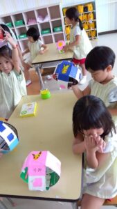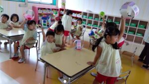 2025年9月19日 ピカチュウボールの制作☆年中クラス ピカチュウボールをみんなで作ったよ🎵 牛乳パックに好きな色のおりがみやピカチュウを貼り 丸めたら・・・完成😆🎶 来週はお遊戯室でボールを使って遊ぼうね🤗✨ もどる