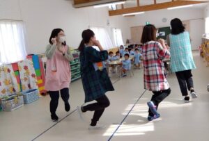 お部屋遊びでは、畑の焼き芋になった子ども達を畑のおばさんがひっぱってぬく!