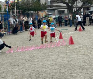 初めてのリレー、お友だちのもとへと一生懸命走りバトンを繋ぎます!