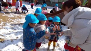 昨日の夜から雪が降りはじめ、園庭にたくさん雪が積もり