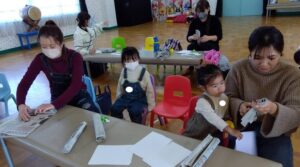 ママが新聞をまるめて一緒に、指をつかって”ペタッ!”